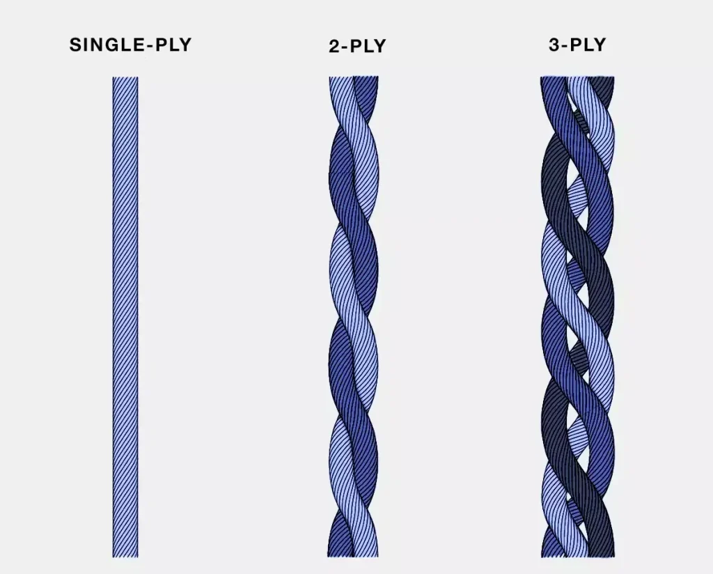 The terms “2-ply” and “3-ply” refer to the number of yarns twisted together to create a single thread used in fabric. A higher ply number indicates a denser and higher-quality fabric.